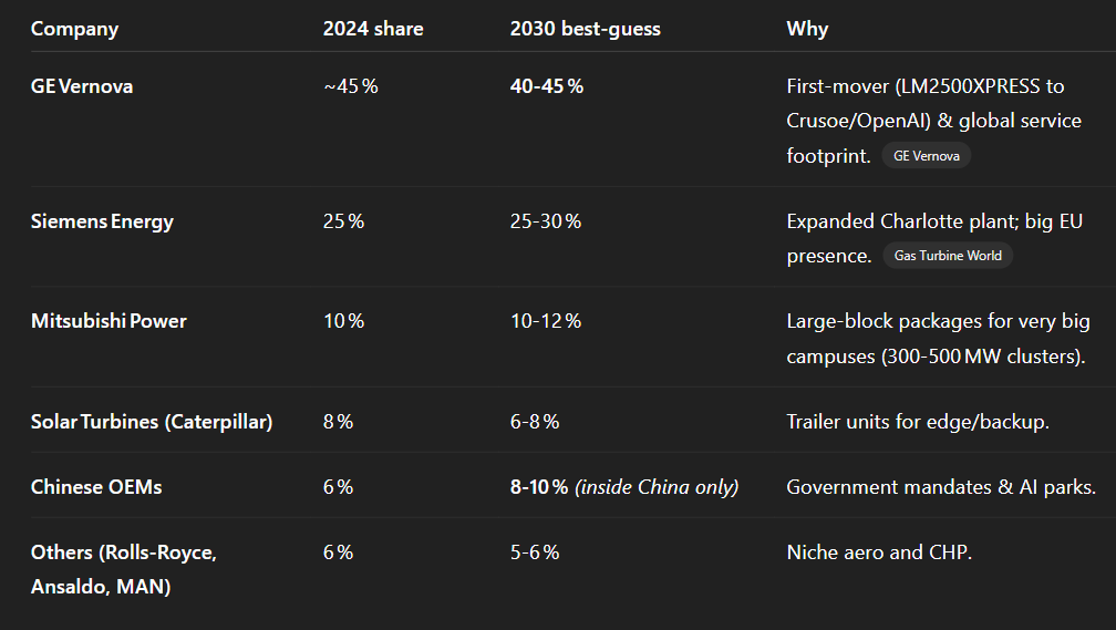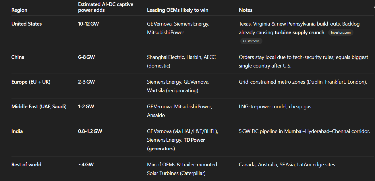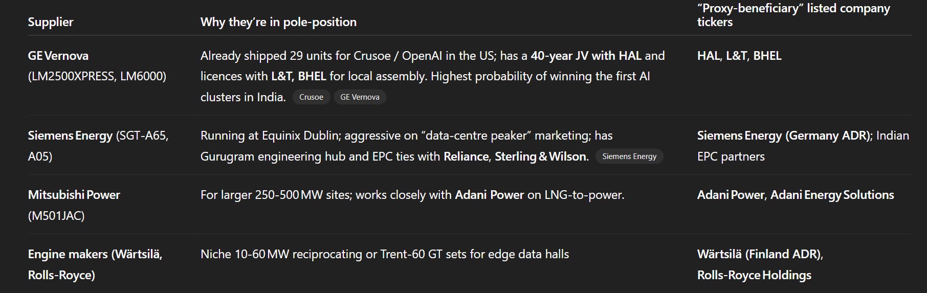 The biggest winners in this gas‑turbine rush are GE Vernova, Siemens Energy, and Mitsubishi Power, with Indian generator maker TD Power Systems supplying key parts.