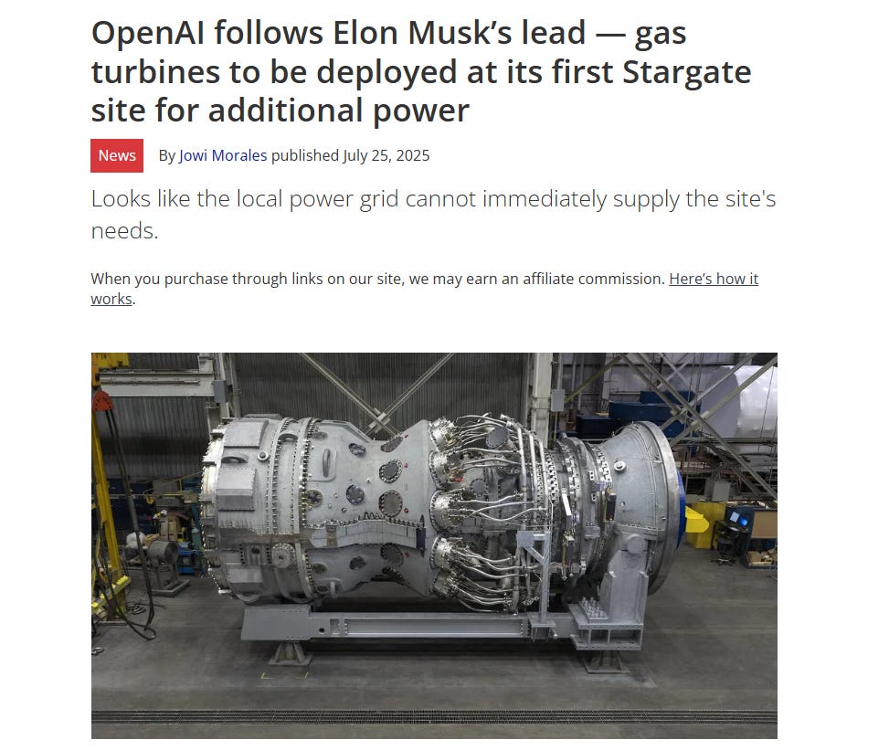 Instead of waiting for the grid to catch up, OpenAI (through a company called Crusoe) is buying and installing gas turbines — like mini power plants.