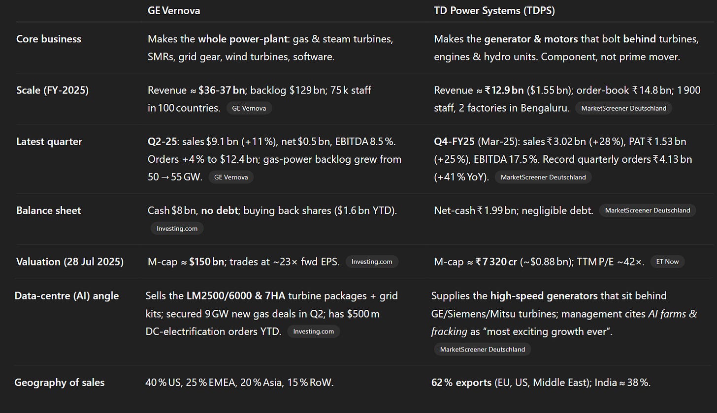 GE Vernova is the elephant— it sells the entire gas turbine and the long‑term service, owns the SMR tech, and is flush with cash. TD Power is the nimble ant— it bolts its generators onto those turbines and ships them all over the world. If the AI power boom really is “jet engines in a box”, both win, but in different ways: GE bags the multi‑billion‑dollar turbine contracts; TD Power invoices the critical spinning part inside every one of those boxes.
