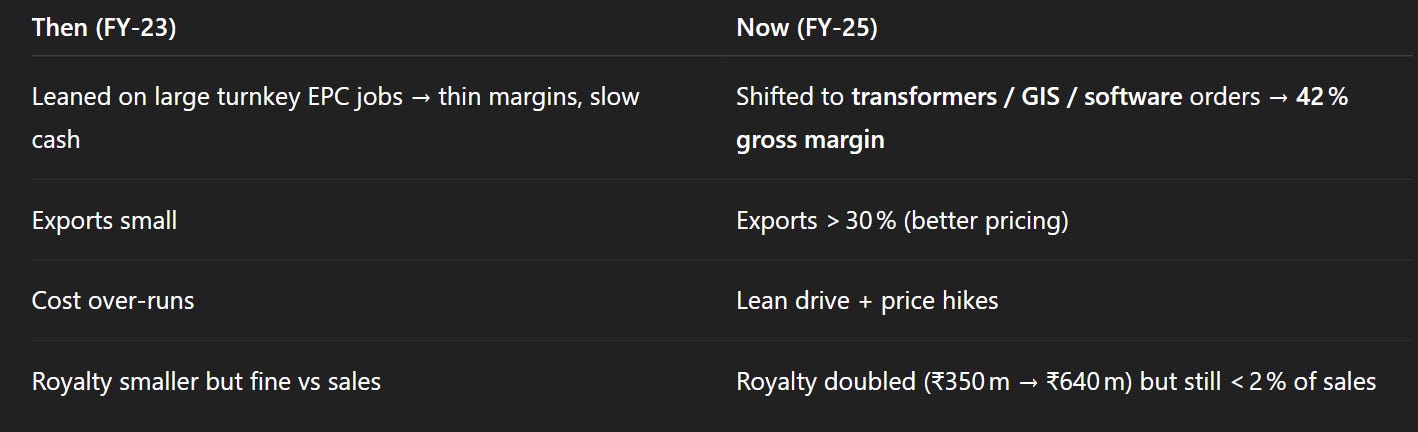 Past pain came from low‑margin big projects. They switched to selling high‑value equipment and exports, so profit shot up. Management sounds confident, backs it with numbers, and is adding an HVDC factory to catch the next wave. Watch royalty fees, new capex pay‑back, and whether 40 % margins stick when pricing stops rising.