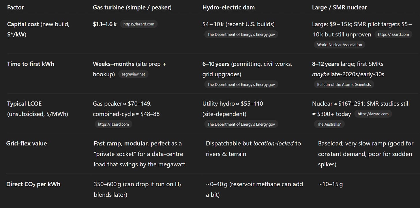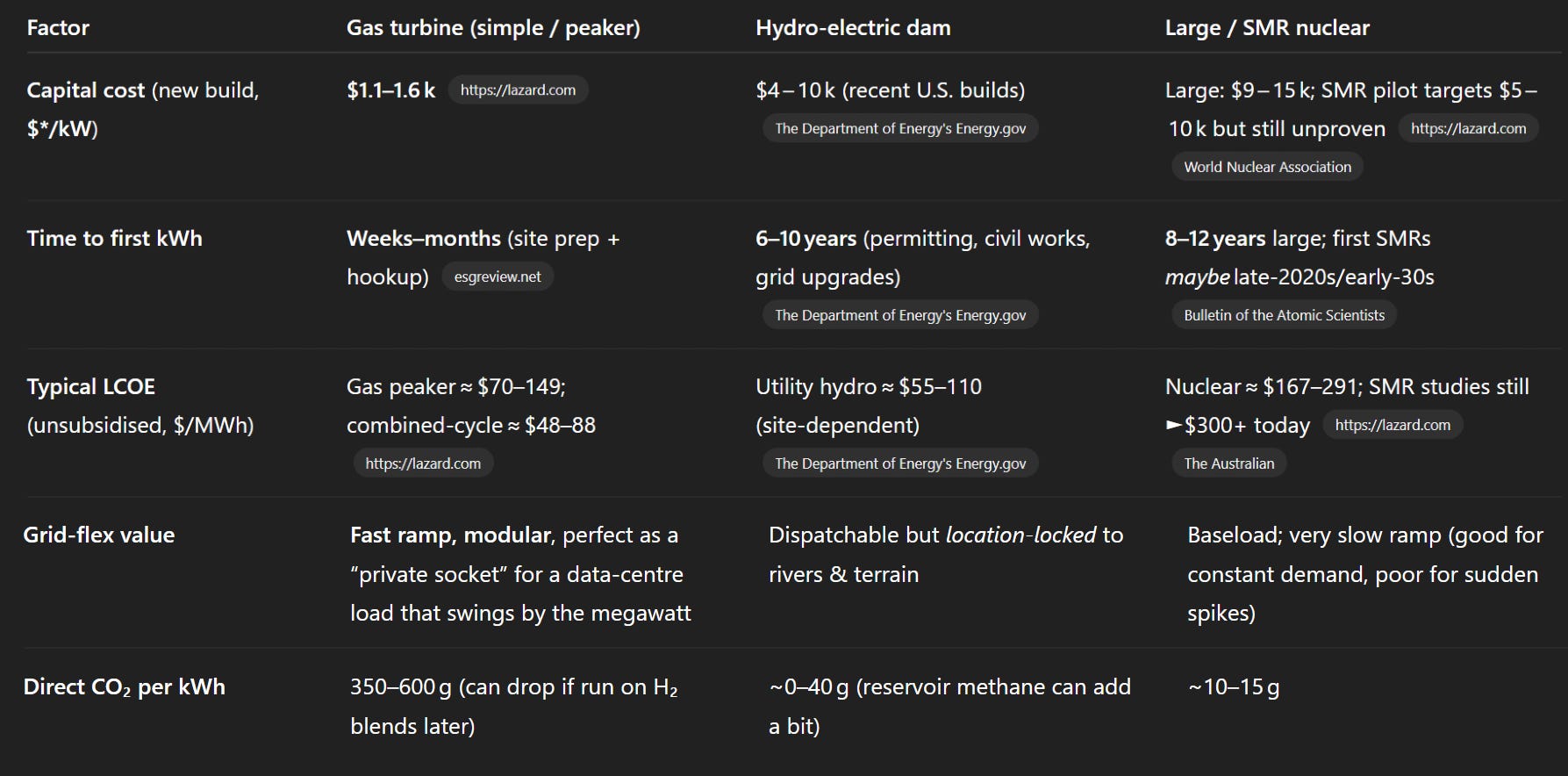 Gas turbines win on speed, siting flexibility and upfront cash, which is exactly what an AI‑compute arms‑race needs. Dams and reactors are cleaner but simply too slow and too expensive to solve a 2025‑level power crunch.